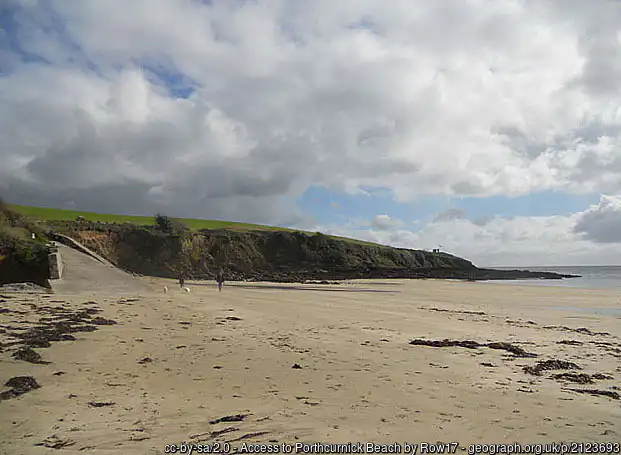 Porthbeor beach is a large dog-friendly beach of sand and rocks on the Roseland Peninsula. The beach is backed by grass-covered cliffs that can be unstable and care needs to be taken.
