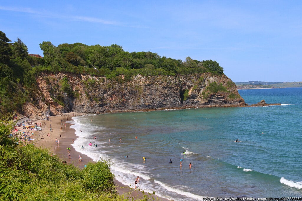 The beach sits at the end of a small valley and is popular with families, kayakers and paddleboarders thanks to the generally calm sea conditions. When the tide goes out, more sand appears, and the cove opens up into a wider space for walking and exploring.