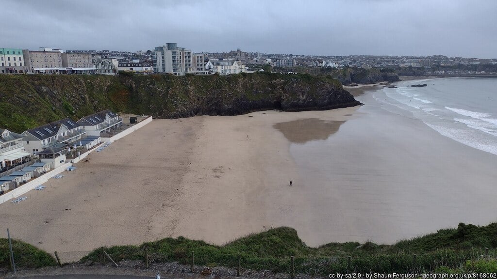📍 Location: Crescent‑shaped sandy cove in central Newquay, below Cliff Road/Barrowfields