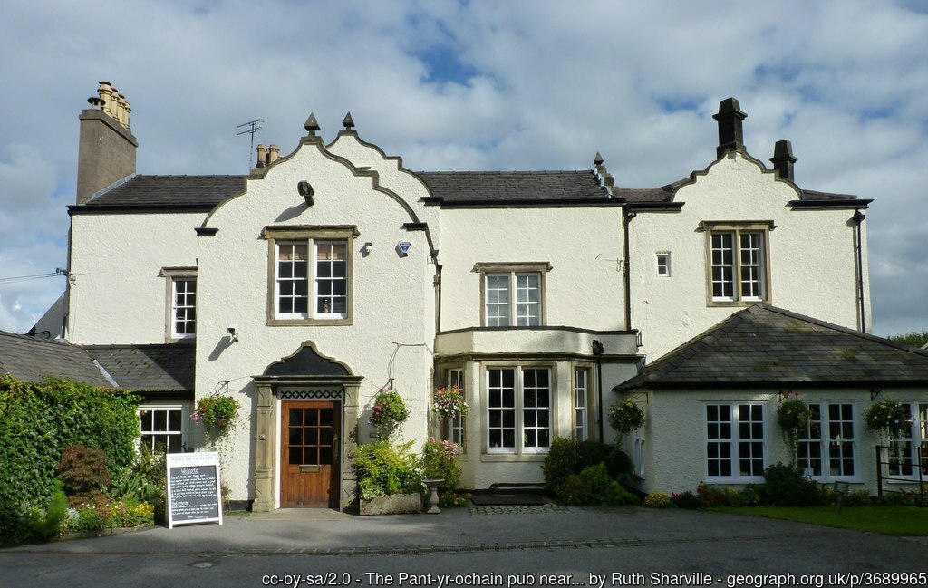The Pant-yr-Ochain sits on the outskirts of Wrexham and has an outside terrace and a large garden with plenty of benches on the grass areas overlooking a small lake.