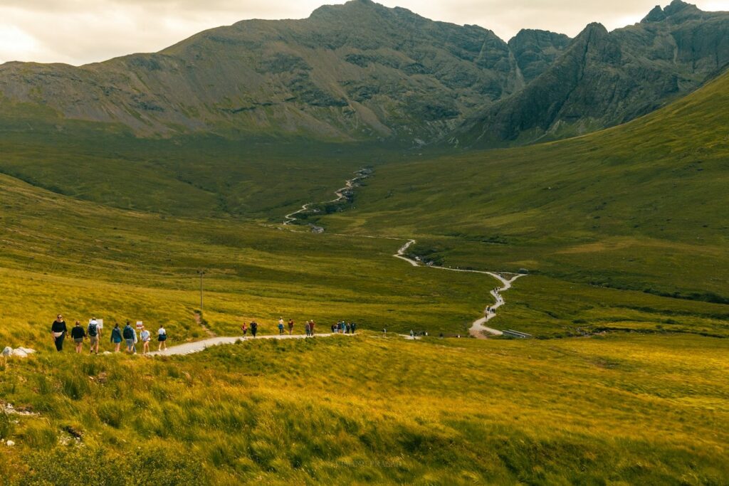 The Fairy Pools are a short drive from the village of Carbost. There is a car park at the start of the trail, and the walk is straightforward on a gravel path with a few bridges.