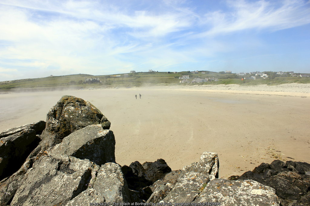 Rhoscolyn Beach, or Traeth Borth Wen, is a south-facing curving sandy beach. At high tide, it is mainly shingle. The beach is backed by marram grass-covered dunes with wooden boardwalks.