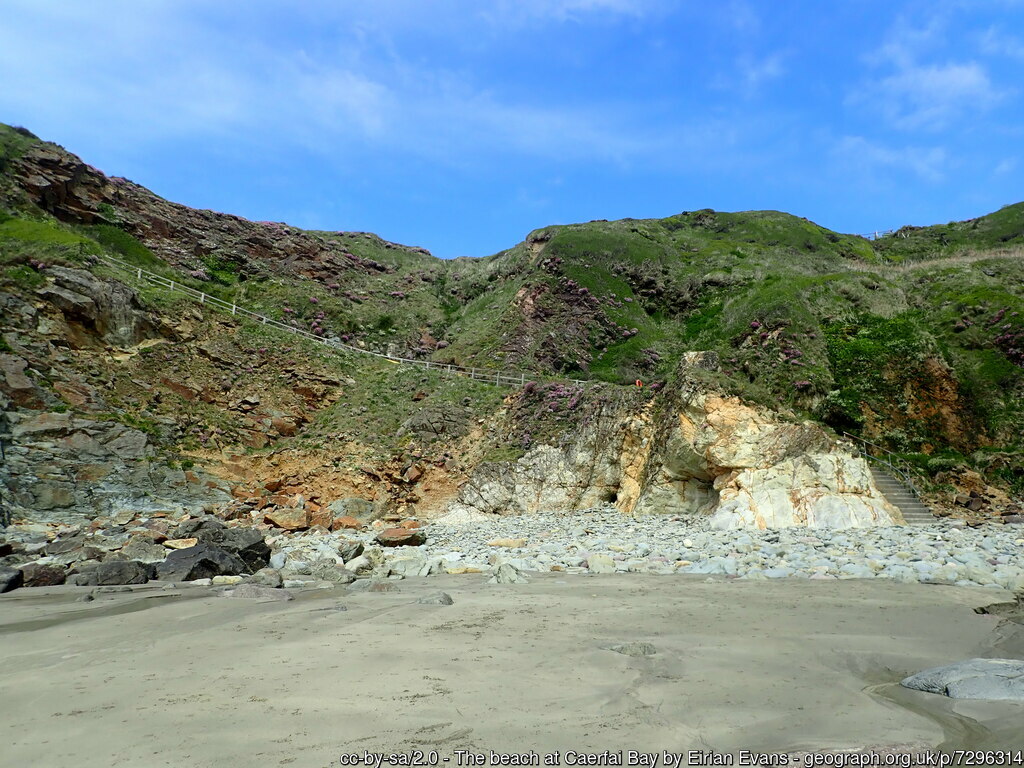 Caerfai Bay is surrounded by high, colourful cliffs made of red and purple sandstone, which add a dramatic backdrop to its sandy beach. This sandstone was quarried for the construction of St. David’s Cathedral.
