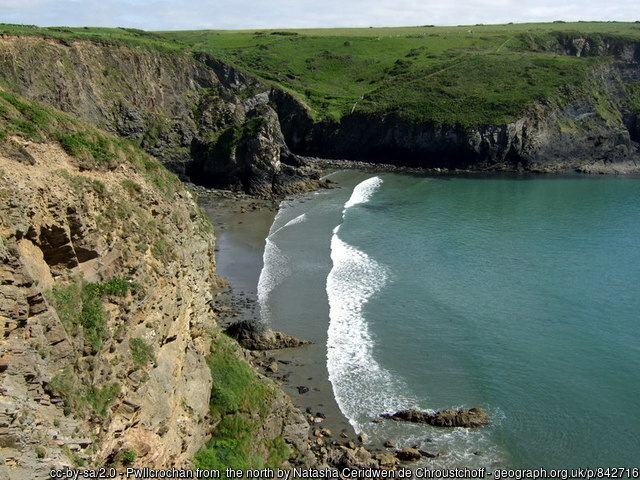Pwllcrochan beach is a dark sandy beach with rocks that disappear at high tide. At lower tide levels, you have lots of beach to explore, and plenty of room for your dog to run around. The sea constantly batters the rocks and cliffs, so caution should be taken when exploring this remote bay.